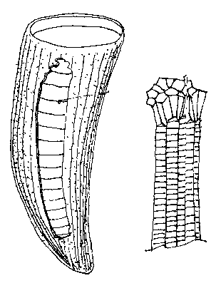 Tabulates were really quite home bodies. They almost never played by themselves, but grew up in neighborhoods or colonies, side by side with their tabulate buddies. And rightly so. Without strong radial septa, their structural rigidity was quite limited. The margin of figure 2 shows a typical corallite arrangement in tabulate coral. The section is parallel to the longitudinal axis. The calices at the top often form polygonal (honeycomb) patterns at the surface (hence the popular name of honeycomb coral). Rugose corals also got together sometimes in colonies, but often stood alone.